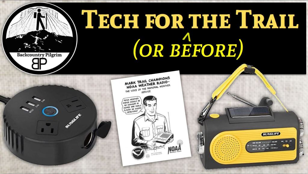 Here is some tech that is good for car camping, pre-hiking, and – for some – even backpacking. First, an emergency radio powered by batteries, built-in solar panel, or hand crank, that features an NOAA weather band, adjustable flashlight, tube reading light, audio+visual distress signal, and a USB charger. Second, a DC inverter for AC or USB power / charging on your drive to the great outdoors.