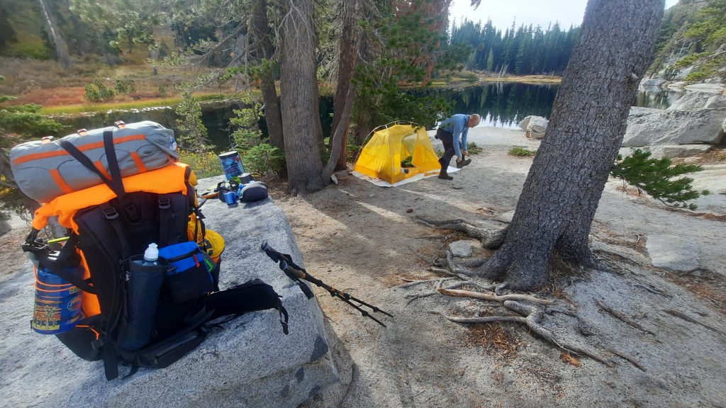 Although it was tempting to drop our bags and set up camp here (a constant temptation all along this route), we decided to push on to our planned destination. Another mile and a half from the dam and 500′ brought us to Rubicon Lake. We left the trail and picked our way along the northern outlet and found several decent campsite possibilities. As always, however, Dominion found us an epic site with a “deck rock” that made for a perfect kitchen / dining room.