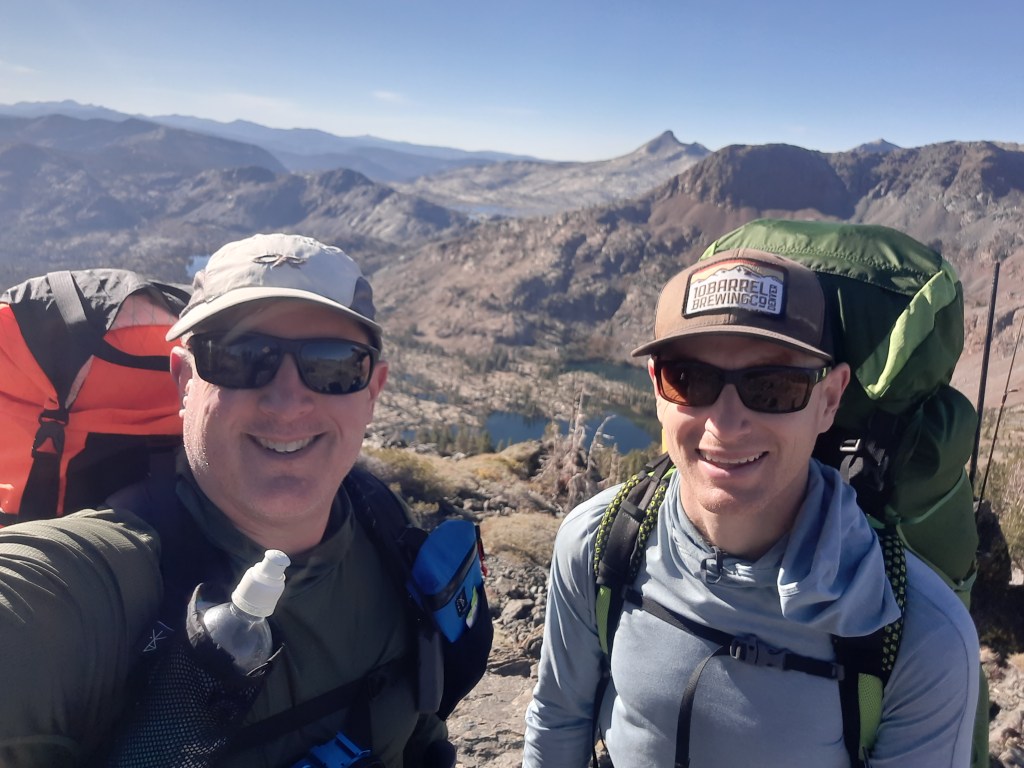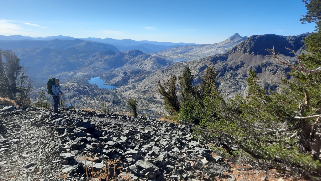Today’s hiking began with a 2.2 mile, 975′ ascent to Dick’s Pass. Although it sounded aggressive it was actually quite pleasant. The grade was moderate and we had more tree cover than I expected. It was not long before we stood topped the pass and could look back at our excellent campsite on Dick’s Lake to our right and the heart of Desolation Wilderness to our left.