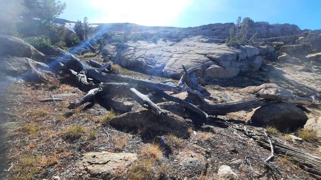 To my left was the rocky expanse I was supposed to arc around in order, I supposed, to avoid a bunch of scrambling. The same kind of rock lay in front of me and probably extended to the meadow itself. The yellow/orange “St. Mary’s Actual” route on CalTopo seemed to be what the guy at the old school Tahoe-to-Whitney website called the “up the middle” route. While more direct, it looked like it involved about 1,000′ of downclimbing a maze of rock. I could not see a route through the trees and had not started early enough to risk hiking time route finding. In any case, I was there to check out the various “Winnet Routes” and none of them went this way.