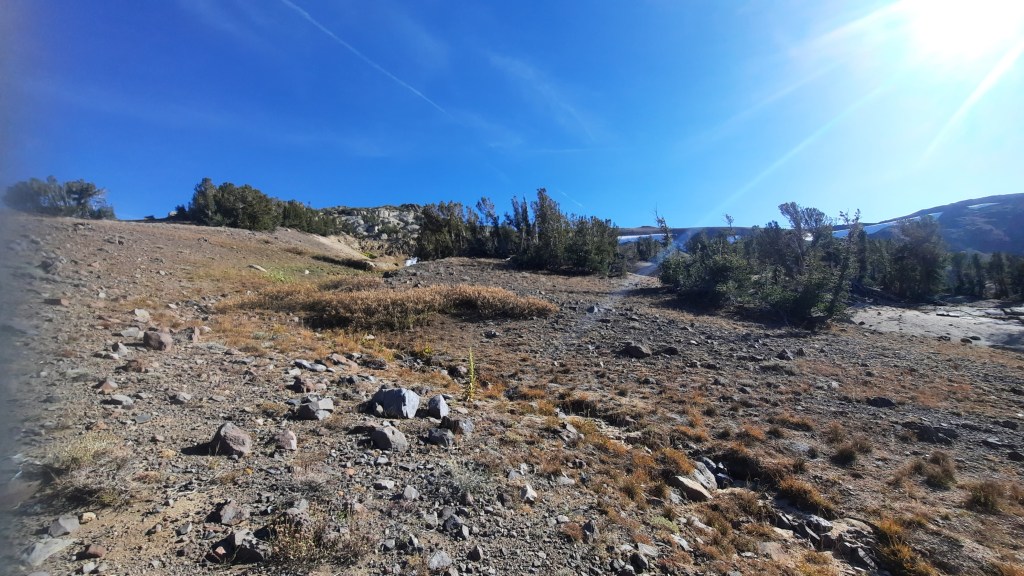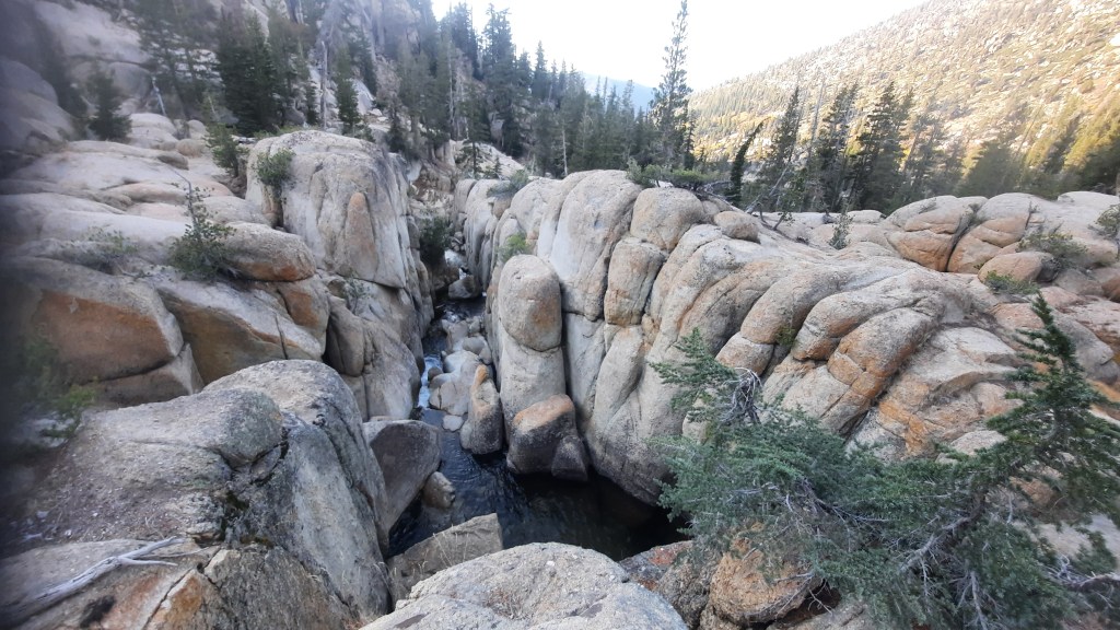 I was now hiking what would be the last day of the section I planned to do after the Carson Pass-Lake Alpine hike I had skipped. Knowing the hill(s) that were ahead I decided to intentionally hike slowly and carefully. I stayed on the edge of the Meadow, passed the wonderful waterfall that marked the time to start looking for an upward route, and once I reached the creek that I would follow up to “The Turn” around the rocks I was up about 50′ above the Meadow. Rather than cross the creek here, I followed vague use trails and rare ducks up the northern slope until I got passed the “Seriously Steep Canyon” to the “Bushy Area,” then crossed to the southern side.