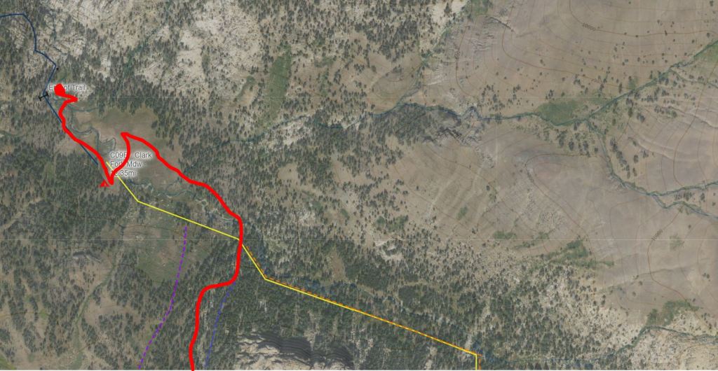My goal from the trail turn off was just to get to the “Brown Mound” I had seen in the satellite image above (where the orange and yellow routes take a sharp 90 degree turn). It turned out to be fairly prominent so it was no problem crossing the canyon and climbing up to it. I then headed in a generally north-west direction through a small high desert area then to an overlook at the edge of the “bowl” where I stopped for a snack. From here I could see Clark Fork Meadow in the distance.