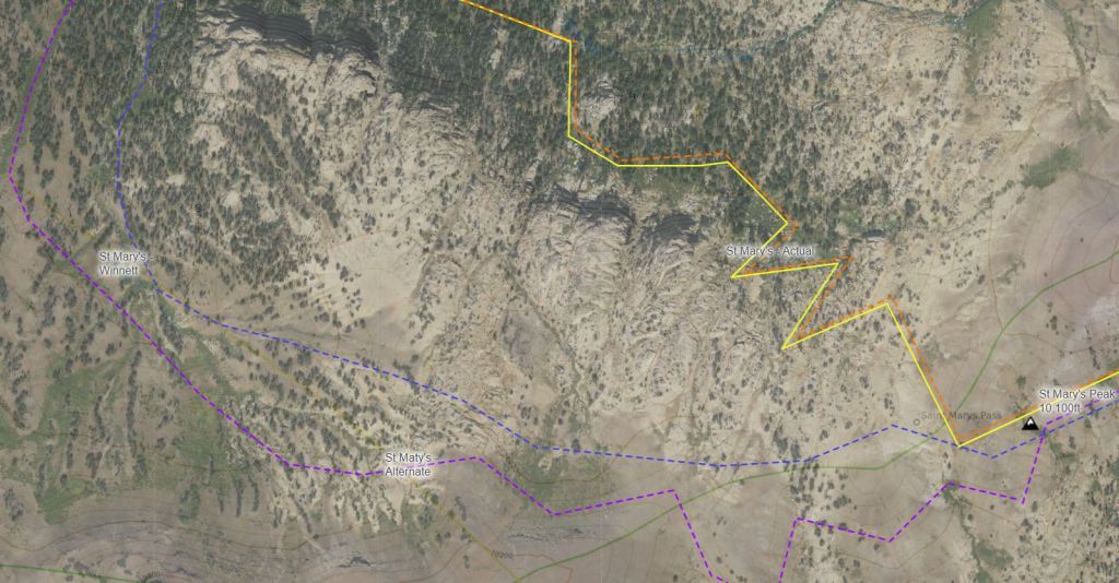 There were two prominent routes on the CalTopo GPS map called “St. Mary’s Winnet” (blue) and “St. Maty’s [sic] Alternate” (purple). At times they looked so close together it made me wonder why they were even seperated. I decided to stick to the blue route as it looked closest to Winnet’s original TYT and because it made sense to basically stay as close to the rocks as possible to save on distance while not having to lose time scrambling over all the mini canyons they created (as fun as that would be!).