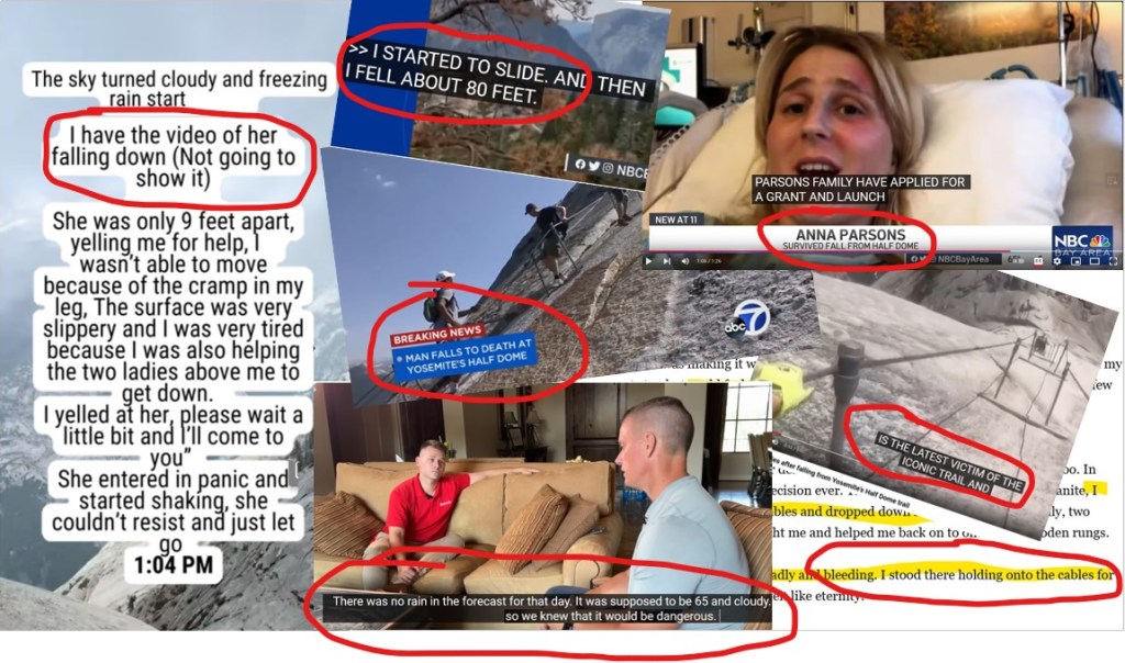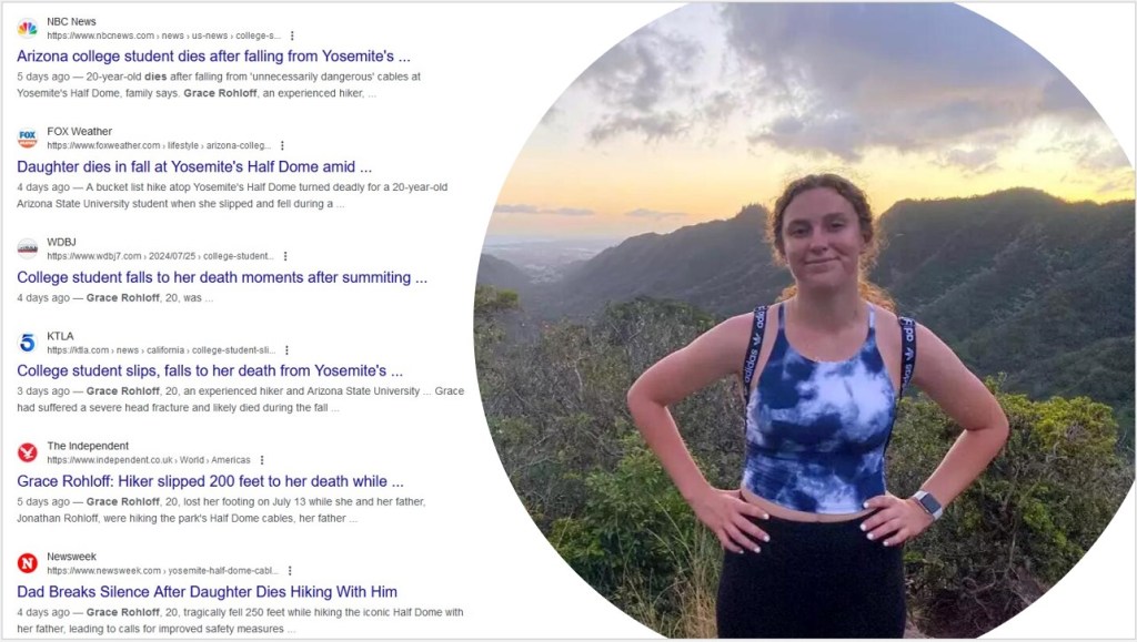 - 2024 July – Grace Rohloff, age 20, slipped and fell from the Half Dome cables.