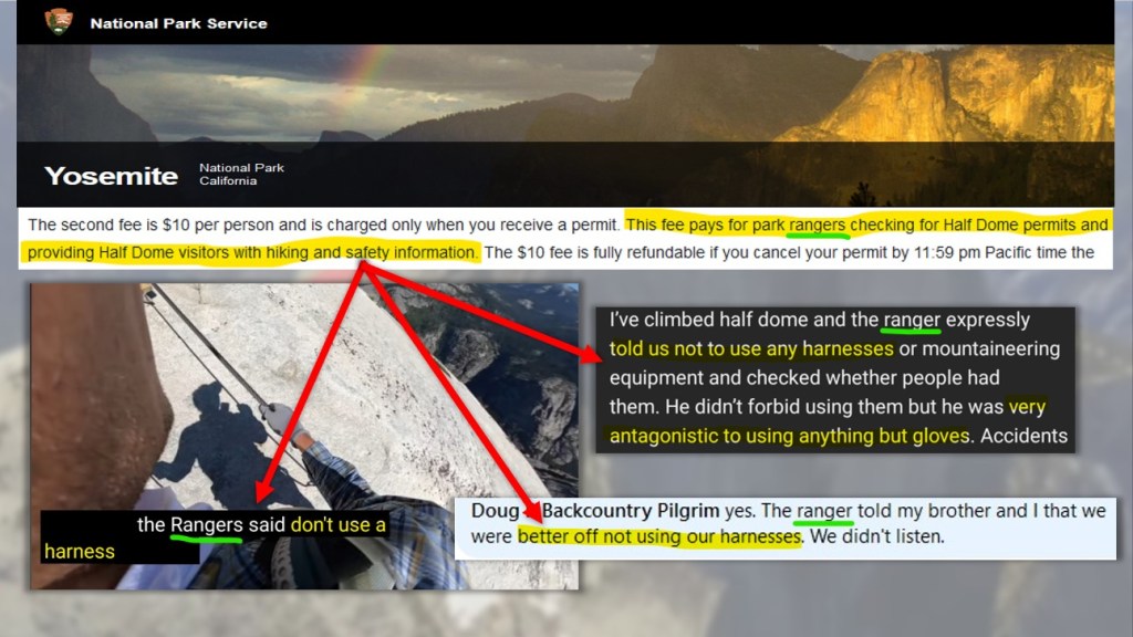 There are even reports (and video) of Yosemite rangers telling climbers that they should not be using it. Now, while I am all about “hike your own hike / climb your own climb,” the idea that National park authorities would tell climbers not to use safety gear seems dangerously irresponsible. What would justify directing people to not use gear that would almost certainly mitigate the majority of deaths on Half Dome?