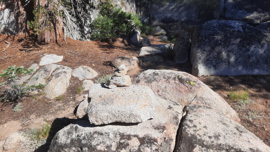 The route is pretty easy to follow until you come to a marshy meadow area a short time after passing through a fun little rocky “mini-canyon” as you head east away from Duck Lake. Once you get to the really boggy area it is time to turn south and head up onto the rocky shelf to your right. Look for a duck (rocks placed in a stack) marking the transition from meadow trail to granite deck. For the next mile or so, you will play “connect the dots” with these these ducks as you navigate across the rocky surface.