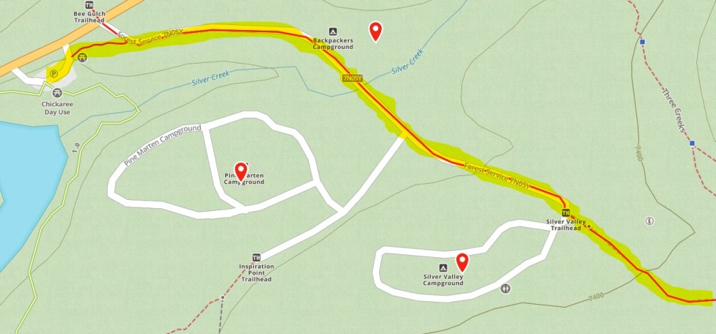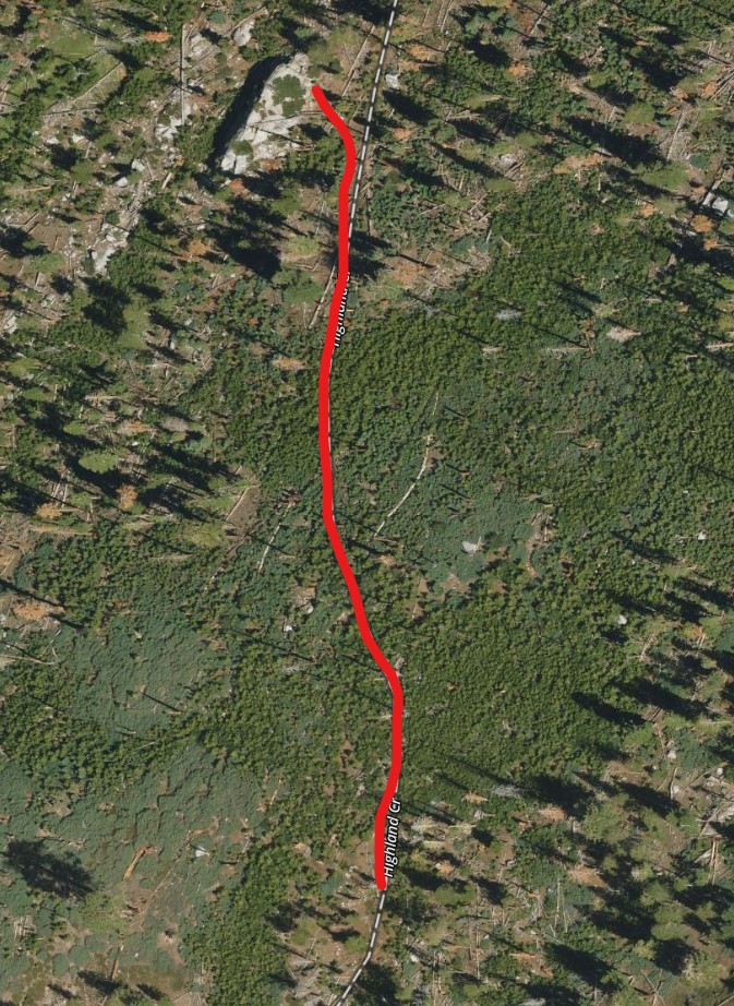 As I discovered after hiking the TYT portion of the Highland Creek Trail, much of this bypass (blue line above) is every bit as difficult to navigate as the TYT which is both shorter (3.5 miles compared to 5) and less steep (685′ elevation gain compared to 1,235′).