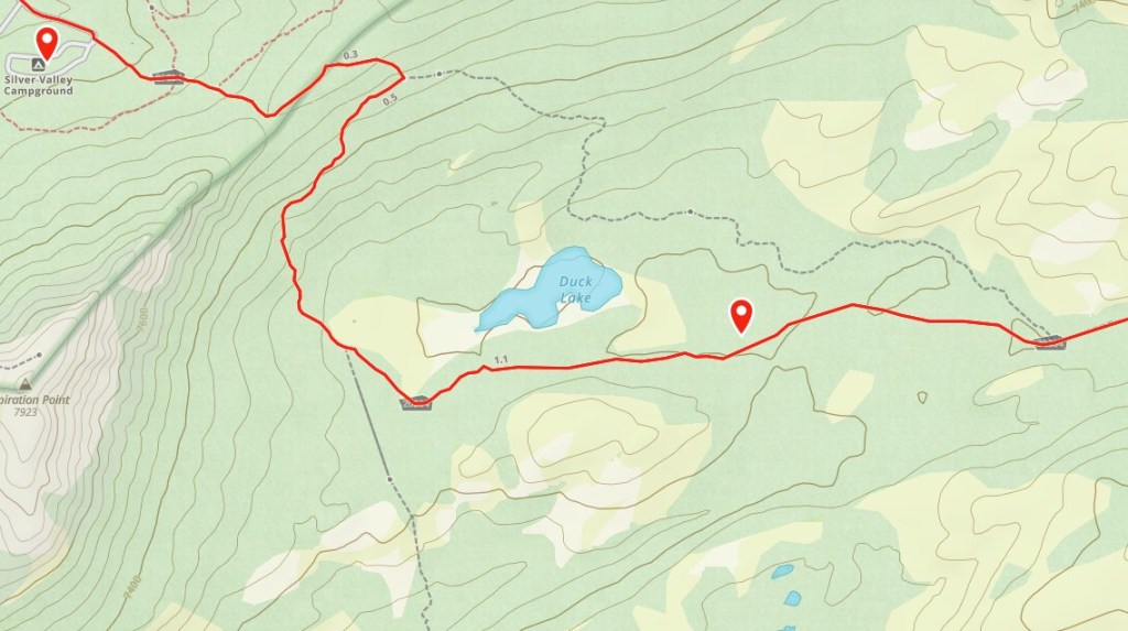 Instead of taking the the Elephant Rock Trail south, continue to follow the Highland Creek Trail as it bends eastward around the south shore of Duck Lake. Soon you will see a rustic shelter that still had bed frames and some assorted pots and pans in it as of 2024. The trial does not go to the shelter but it’s a fun place to take a snack break and gaze at the beautiful Duck Lake.