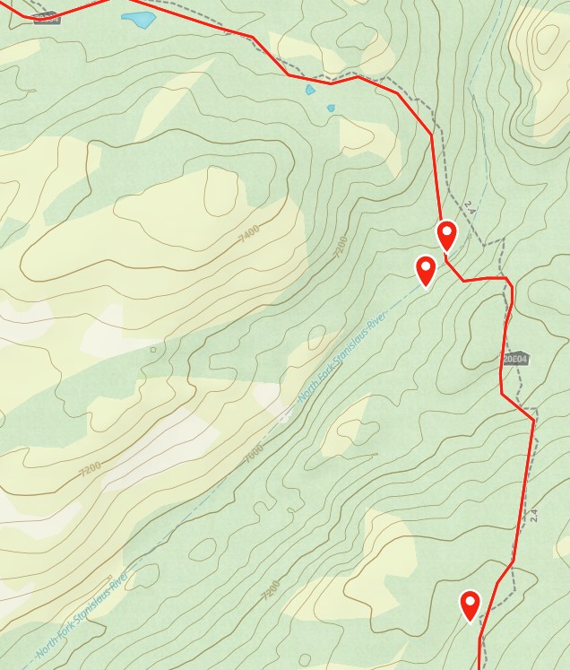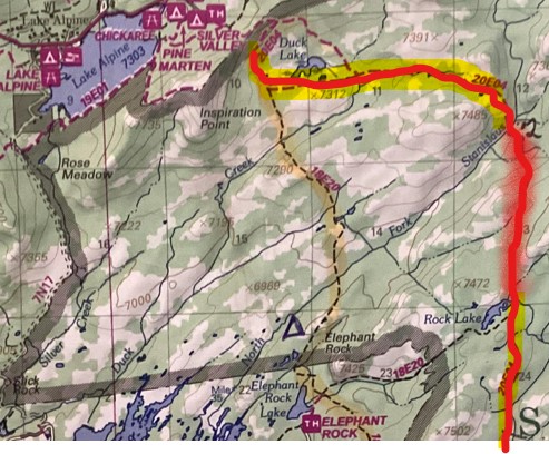 Just before making a left (Eastward) turn toward Duck Lake, the Elephant Rock Trail (18E20) branches off from the Highland Creek. This is the trail you could use to bypass the problematic part of the TYT between the Stanislaus River and Rock Lake. By following the Elephant Rock Trail about 3 miles (335′ of ascent) to where it bends East to Rock Lake (another 2 miles and 900′ of elevation gain), you would meet back up with the Highland Creek Trail (the TYT) where you could turn south and continue.